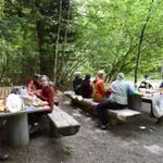 Nun ging es weiter zum Mittagsrast. Dank der Karte und den Erklärungen von Christina fanden wir die Waldhütte Langentannen in Dürrenäsch auf Anhieb. Reto machte sich daran, das Feuer zu entfachen. Das Timing stimmte, denn es hatte eine tolle Glut als die Teilnehmer angeritten kamen. So musste der selbst mitgebrachte Mittagslunch nur noch grilliert werden. Trotz Sonnenschein war es kühl. Da genoss man die Wärme des Feuers. Im WoMo kochten wir Wasser für Tee / Kaffee, dieser wärmte von Innen und passte prima zum leckeren Kuchen von Evi.