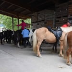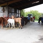 Unter dem Vordach von Bauer Hagenbuch wurde bereits vor Ankunft der verschiedenen Reitgruppen, die Verpflegung für alle Pferde vorbereitet. Die ReiterInnen konnten Ihre Pferde anbinden und mit Heu & Wasser während der Mittagspause verpflegen.