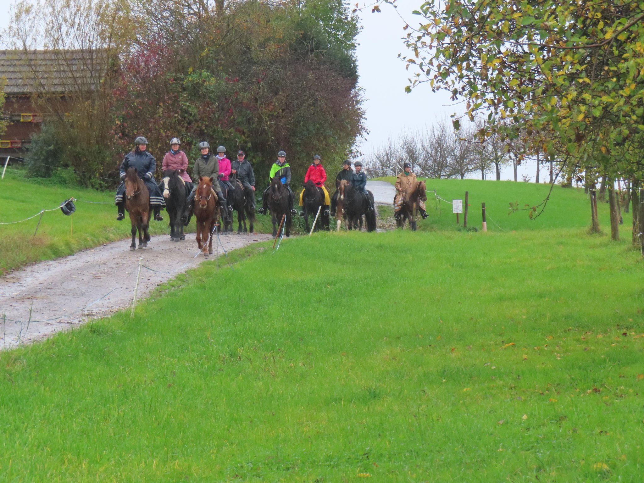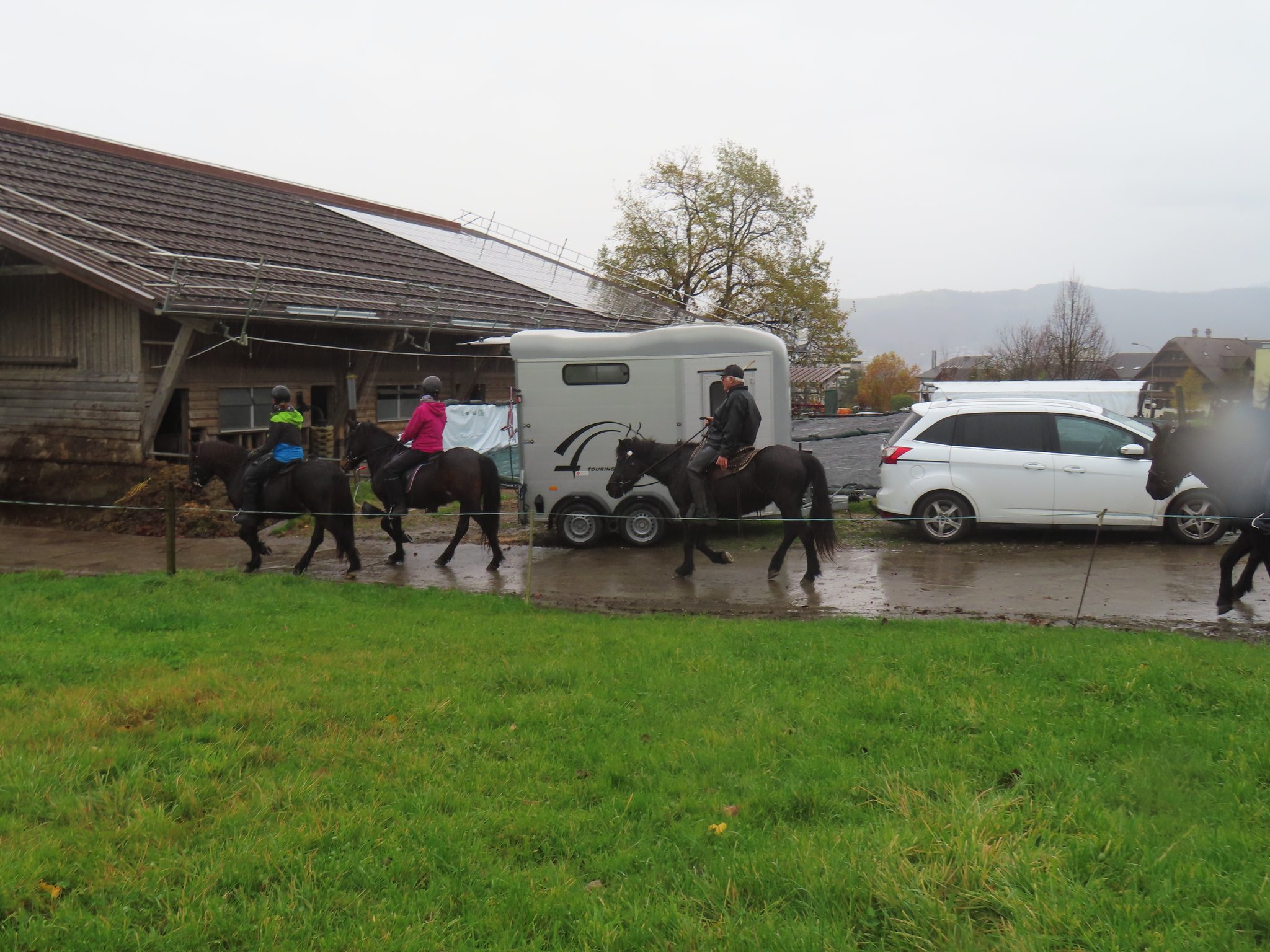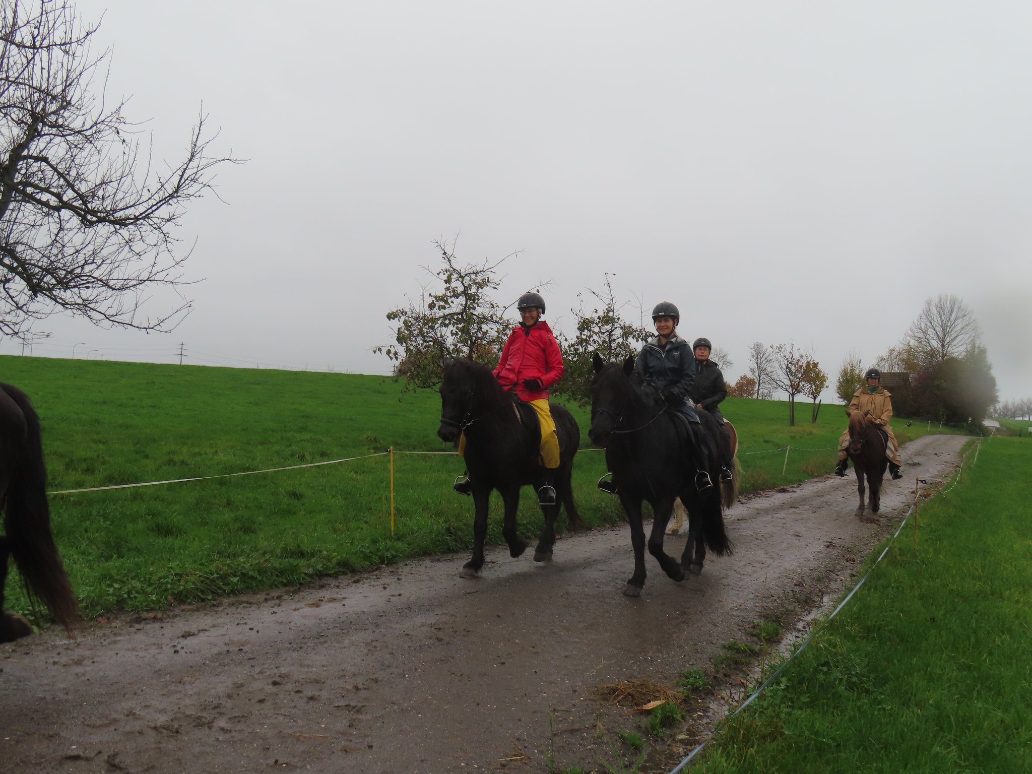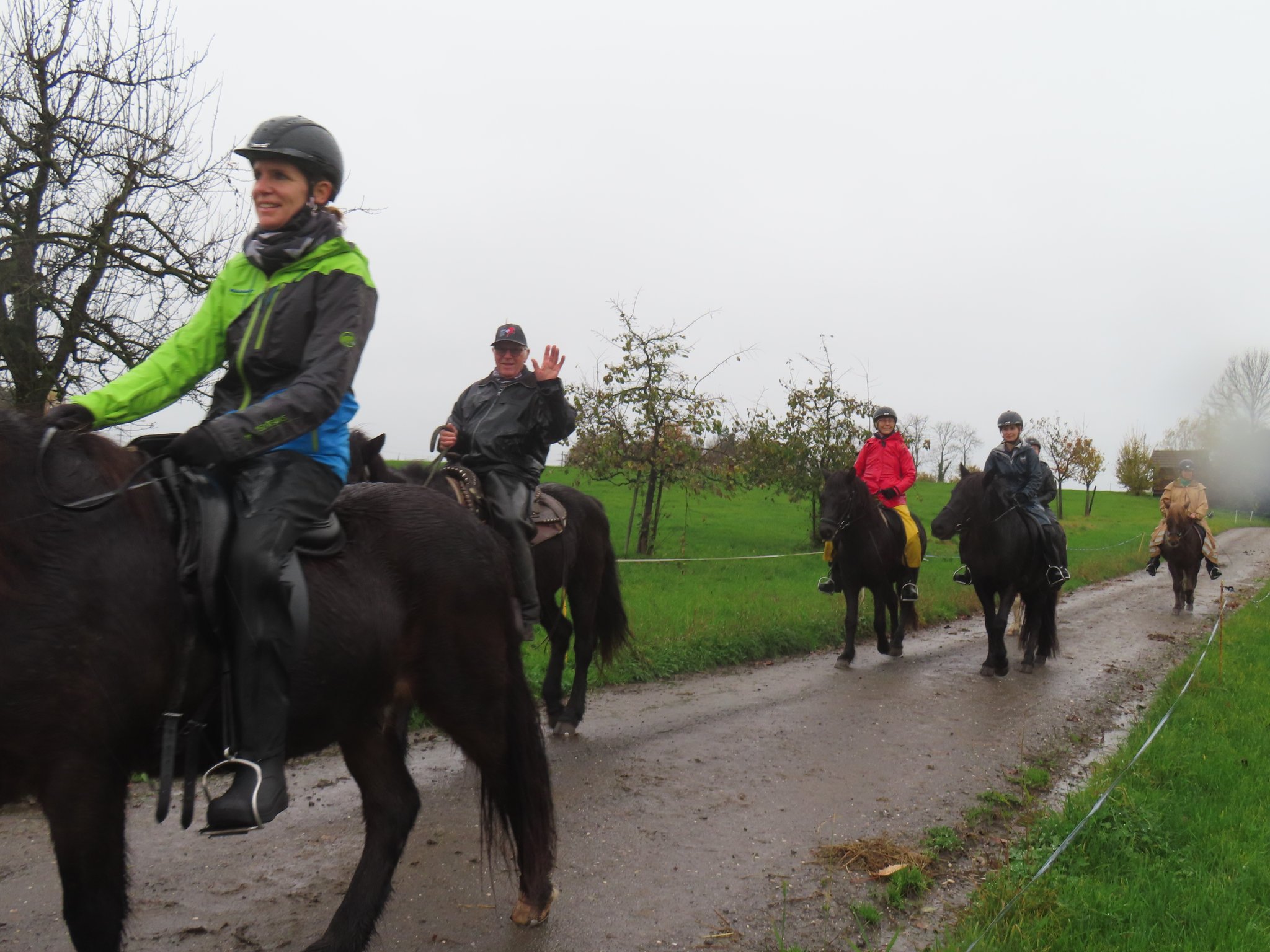 Nach einem gemütlichen Frühstück mit Kaffee, Tee und Zopf ging’s um 10 Uhr los. Der Ritt führte im Schritt, Trab und natürlich im Tölt durch herbstlich bunte Wälder, vom Öpfelhof nach Wart durch den Herrenwald bis ins Frauental und zurück – begleitet von Regen, etwas Wind und bester Laune.